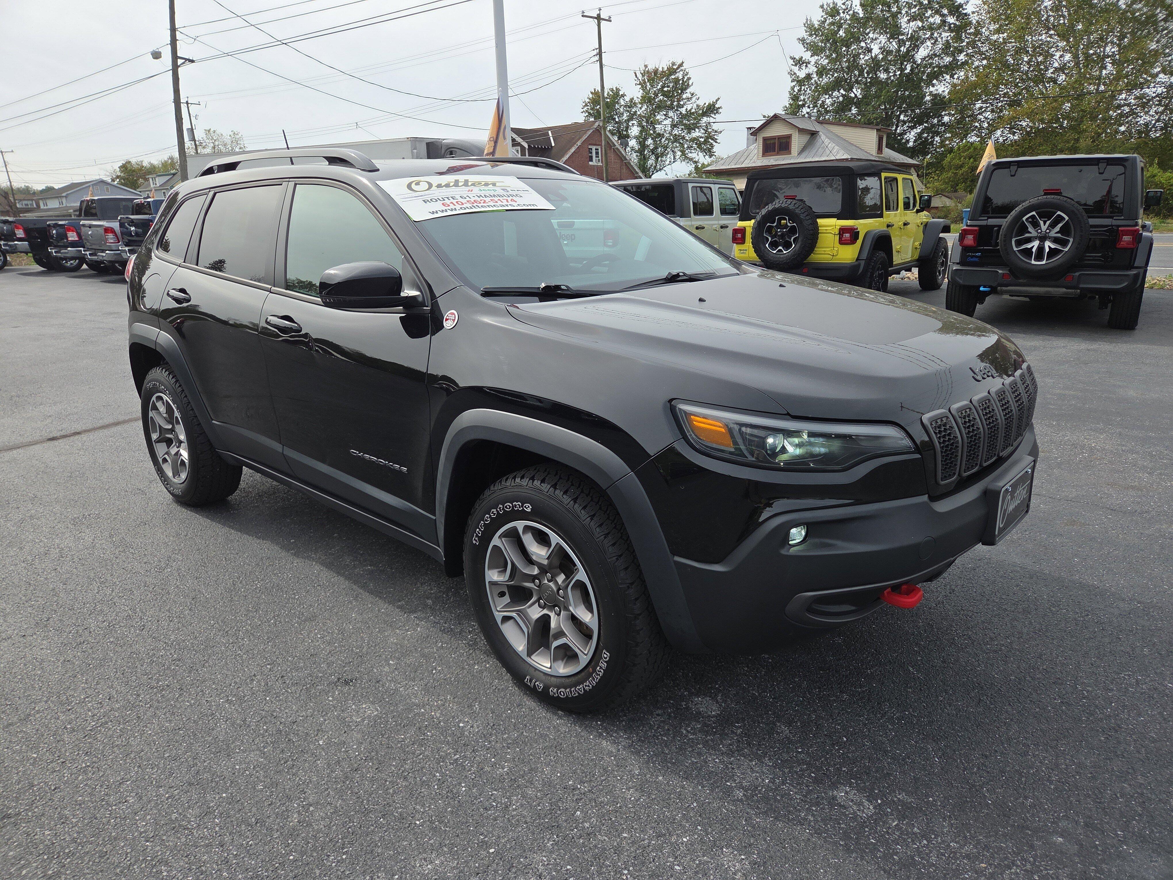 Recent Arrival! Diamond Black Crystal Pearlcoat 2022 Cherokee 4D Sport Utility 3.2L V6 Trailhawk 9-Speed 948TE AutomaticJeep Details:* Limited Warranty: 3 Month/3,000 Mile Runs From the Date of the CPOV Sale, or at the expiration of the remaining 3/36 Basic New Vehicle Warranty (whichever is more beneficial to the customer) (for Certified Pre-Owned Go program), 3 Month/3,000 Mile (whichever comes first) after new car warranty expires or from certified purchase date (for Certified Pre-Owned Gold program), 3 Month/3,000 Mile (whichever comes first) after new car warranty expires or from certified purchase date (for FCA US LLC Certified Pre-Owned program)* Roadside Assistance* Vehicles Up to 75,000 Miles and/or 5 Model Years. 24-Hour Towing & Roadside Assistance, Car Rental Allowance, CARFAX Vehicle History ReportTM and an Introductory 3-month Subscription to SiriusXM Satellite Radio & Certified Warranty Upgrades (for FCA US LLC Certified Pre-Owned program), Vehicles Between 6-10 Model Years and/or 75,001-120,000 Miles. Thorough Reconditioning Process Using Authentic Mopar Parts. 3-Month Trial Subscription for SiriusXM GuardianTM and Satellite Radio (for Certified Pre-Owned Go program), Vehicles Between 0-5 Model Years and/or 75,000 Miles. Thorough Reconditioning Process Using Authentic Mopar Parts. 12 Month/12,000 Mile Extended Care Premium Warranty, Car Rental Allowance, 3-Month Trial Subscription for SiriusXM GuardianTM and Satellite Radio (for Certified Pre-Owned Gold program)* 125 Point Inspection* Transferable Warranty (for FCA US LLC Certified Pre-Owned program)* Vehicle History* Warranty Deductible: $100* Powertrain Limited Warranty: 84 Month/100,000 Mile (whichever comes first) from original in-service date (for FCA US LLC Certified Pre-Owned program)Your Locally owned Dealer since 1979! Call us at 610-562-5174 or visit us on the web at www.OUTTENCARS.COM.